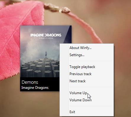 You can change songs from Winfy’s interface, or use the context menu options to scroll through songs or adjust playback volume.