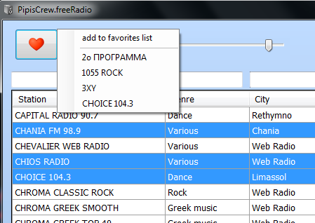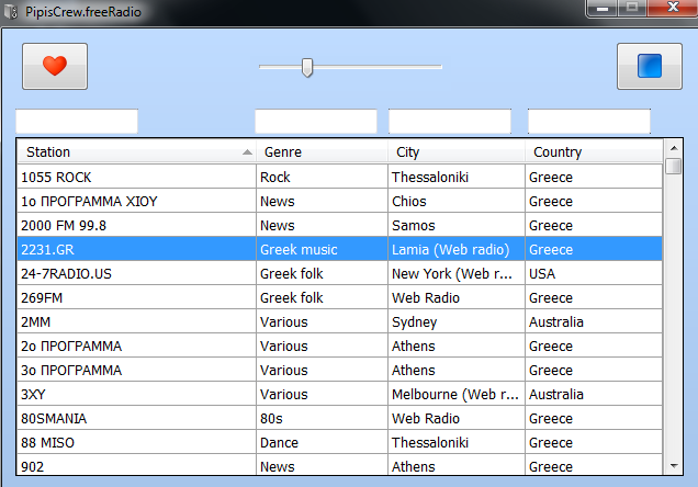 freeRadio does not need any installation and it is a portable app. Once you download it, you can directly open it and start listening. Two buttons are given on top: play and pause. The red button can be clicked to play a station and the blue to pause. The volume can be adjusted manually by using the slider given in between the two buttons.