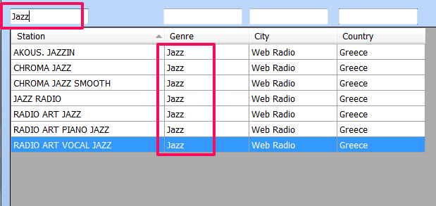 First of all, you can filter the list of radio stations by genre, name, city or country. A blank search bar, above every panel, is given on the interface where users can type and filter the list. You can filter the list by typing in any of those search bar. Suppose, if you want to filter the list by genre, you can type your desired genre in any search bar. It is not necessary to type in the specified search bar. The list of radio stations provided by freeRadio is very big and the filter options comes in very handy.