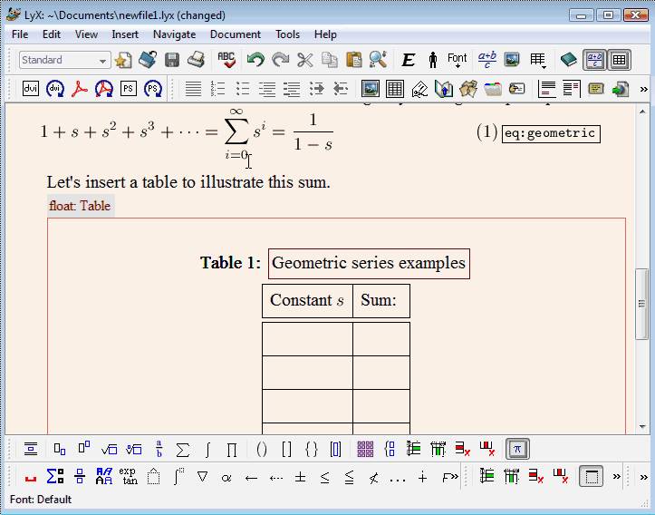 Primary function of LyX would be writing of mathematical formulas, and to add them to the document you basically just have to click on the appropriate symbol from the selection below the document. The entire process is very similar to that of Word math functions. Same thing goes for tables. Text formatting can be changed in the toolbar at the top.