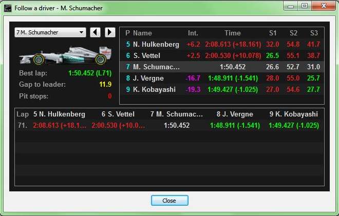 Also, you can click on the lap time comparison button (standard menu on the top left) and view lap times of the drivers you choose. All of the tools can be accessed from that same standard menu. Follow a driver is one of them. Clicking on that button you can check on various statistics about the chosen driver, you can view driver’s best lap, standings, etc. Picture below shows us the Follow a driver window