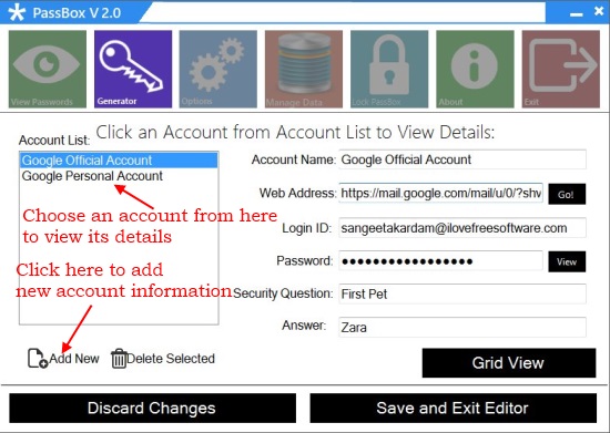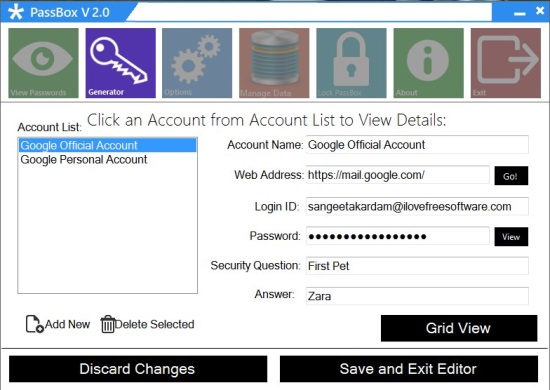 The View Passwords icon takes you to a window where you can add new accounts’ information with their respective passwords, and view information on accounts you have added. This includes your account name, web address (if any), login ID, password, and security question and answer. You can directly open the webpage for that account from here (the Go button), or even view all accounts’ information together in Grid View.