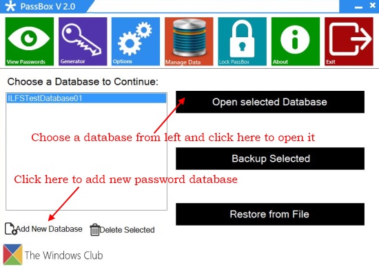The main screen of the app contain icons on the top to carry out different tasks. The Manage Data icon takes you to the database manager where you can create new password databases, open selected ones, or even backup and restore database files.