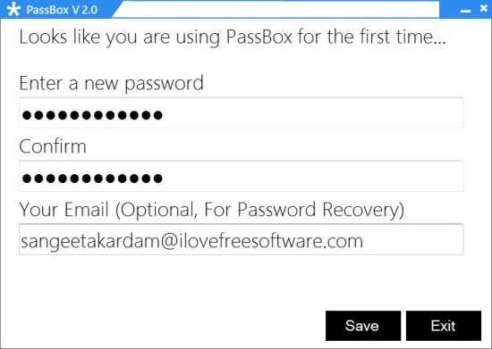 PassBox comes with a modern UI interface. This makes it look clean and easy to use. When you launch it for the first time, it will prompt you to choose a master password. Apart from that, it will also ask to provide your Email to recover the password in case you forget it. So it takes proper care that you won’t lose your important password data anyhow.