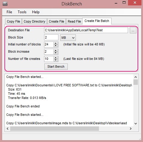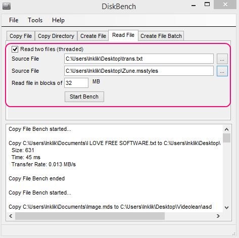 The freeware also lets you check hard disk performance when it creates a file or batch of files. Simply go to required tab and give specifications: destination, block size, number of blocks etc. And click on Start Bench. Also to check hard disk speed of reading a file, go to Read file tab and select desired file, enter the read block value, and click on Start Bench. You can then understand the PC performance by reading the report.