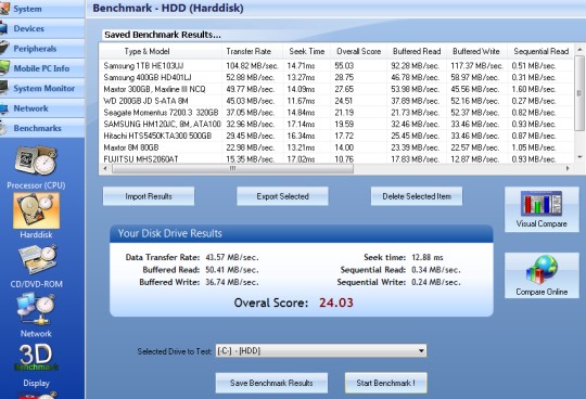 • Lets you benchmark hard disk, CPU, Display etc. which you can compare with other saved bookmarks.