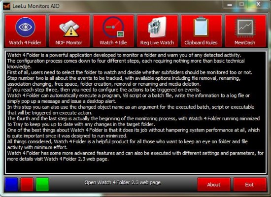 LeeLu Monitors AIO is a free software that offers a collection of multiple Leelu Soft system monitoring tools to help you track folders, memory, and registry files on your system. It’s a handy and reliable software that monitor various components of your system and notifies you if it finds something defective. LeeLu Monitors AIO is composed of the following Leelu Soft applications: Watch 4 Folder, NOF Monitor, Watch4Idle, Reg Live Watch, Clipboard Rules, and MemDash.