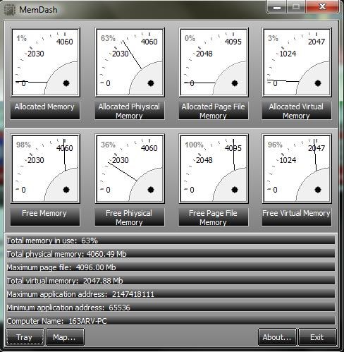 - MemDash: This is the last app in the list, and it displays a graphical view of various memory aspects in your system, including allocated and free memory (physical, page file, and virtual).