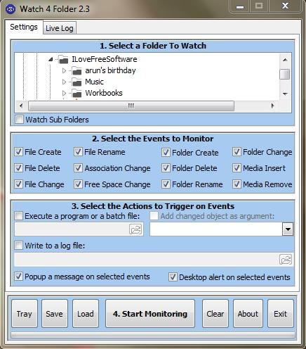 - Watch 4 Folder: This app lets you monitor folders on your system for various event (like file removal, renaming, free space, association changing, folder creation, renaming or removal, media insert, media deletion, etc.) and get message pop ups, desktop alerts, or execute specific action for defective activities.