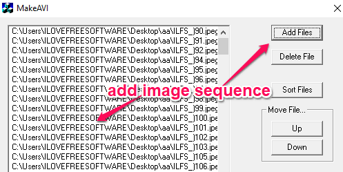 Step 1: To get started, simply install and open MakeAVI. Then select the “Add Files” button visible on the right panel. After that, you can select the image sequence folder to import the images for creating slow motion video.