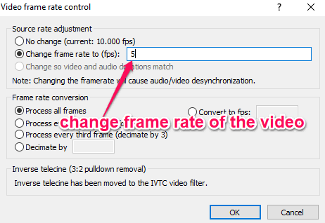 Step 3: When you do that, a new window will appear where you would need to select “Change frame rate to” to reduce the frame rate of the video. For this, you can define any FPS value in the associated input field. As soon as you do that, click “OK” and then it will convert the image sequence into a slow motion video. You can save the video as an AVI file from the “File Menu”.