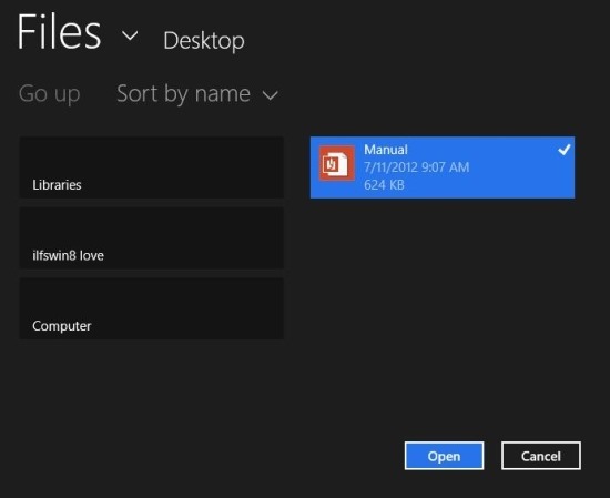 To open up a PDF file in this PDF reader for Windows 8, simply click on the browser option and you will be taken to the interface as shown below in the screenshot. To select a PDF file, just click on it and it will be highlighted as seen below; now click on the open button which is located in the botton right corner of the app window and you will have successfully opened up your PDF file in Windows 8.