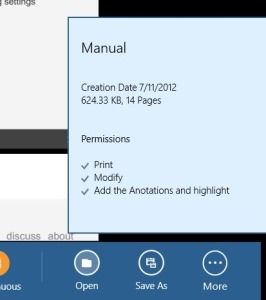 This option menu provides with different set of features like the ability to search for things in the PDF, switch the viewing mode between single and continuous, open and save PDF files. Also, clicking on the ‘more’ button located in the far right corner of the app will bring up the two options name : rotation and properties. When you use the properties options, you will be presented with the pop up as shown below that will display the properties of the document that you are viewing. ![]()