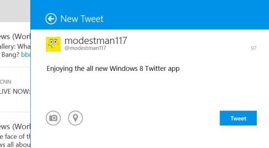 And now you can experience and enjoy the official Twitter app for Windows 8 in the modern interface on your Windows 8 device. The app simpler and better looking than any other Twitter app available for Windows 8. As expected the app is quite simple, subtle, and elegant; but it is a little different for the mobile and web version of the app; Twitter app for Windows 8 has it’s own look and feel which is quite pleasing for now. The interface of the app is shown below and the official Twitter app for Windows 8 also runs amazingly well in the snapped mode. ![]()