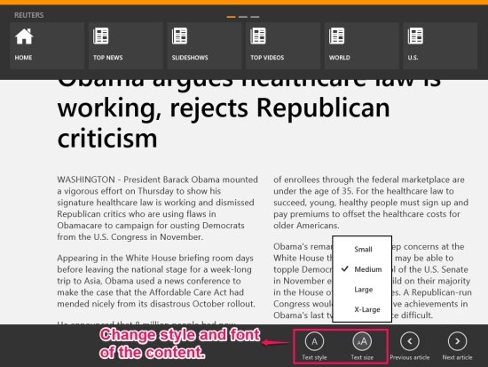 Reuters app lets you change the style and font of the text. To change, click on the article/news you want to read, then right click anywhere over the news. On the bottom right corner of the screen, you will find options: Text Style, and Text Font. Text font provides four different options to change the font: Small, Medium, Large, X-Large.