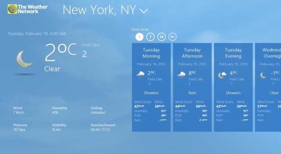 The app shows you the current conditions of your location, long term forecasts, hourly forecasts, and more. This weather app for Windows 8 has a really nice interface and it really simple to use and navigate through.
