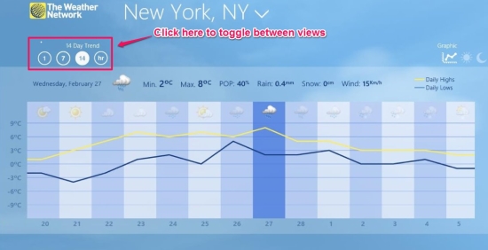 This weather app for Windows 8 provides you with short-term view as seen in first screenshot of this post. Also you can cycle between hourly, short-term, long-term, 14 day trend by clicking on the available options. I have switched to the 14 day trend in the screenshot below which provides me with a graph that systematically shows the details about the weather.