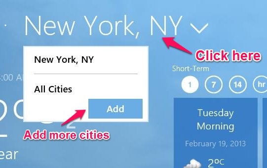 This weather app for Windows 8 provides you with the feature to add multiple locations. To add more cities just click on the area pointed out in screenshot below and then click on the add button to add more cities to the weather network app for Windows 8.