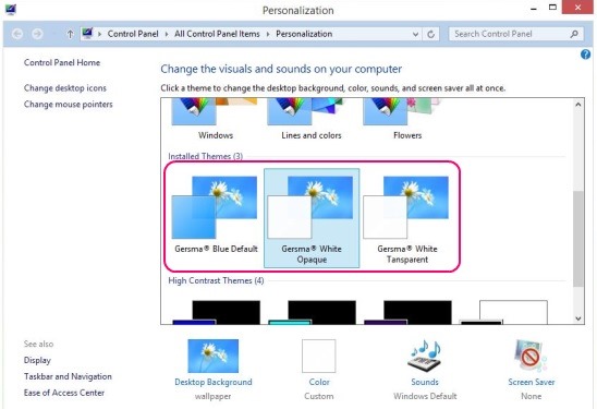 Then go to desktop and right-click and choose Personalize, to open up the Personalize window. Simply scroll down to Installed Themes, you’ll see the three gersma themes. All you have to do is click on the desired theme (in our case Gersma white-opaque ). And that will be all.