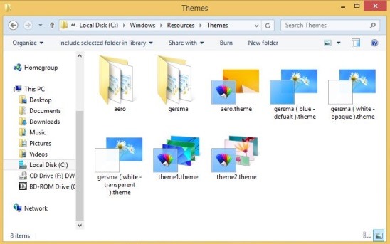 This tutorial makes use of a set of 3 free themes for Windows 8.1 called Gersma, the download link is at the end of this Windows 8 tutorial. The three themes gives three different colors to the border. The themes are: gersma blue – default, gersma white – opaque, and gersma white – transparent. All you need to do is simply extract the downloaded archive anywhere and then copy paste the 3 themes and gersma folder of that extracted folder in the following directory: C:\Windows\Resources\Themes of your Windows device.