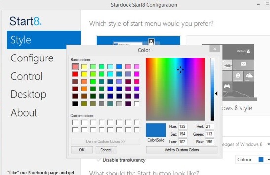 For that simply right-click on the Strt8 Start Button and choose Configure Start8. Next, simply uncheck Disable translucency option under the Style toggle of Start8 Configuration window and click on the color button. Then give following values for RGB colors: Red = 0 Green = 114 Blue = 201. (If in case you chose gersma white – transparent theme, then give Red = 21 Green = 113 Blue = 196, and for gersma blue – default, simply choose auto color).