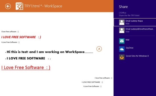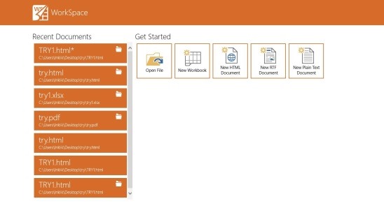 One good thing about this Windows 8 office app is: the app doesn’t require internet connection to run. So you can work on multiple files of different formats at one time without getting connected to the internet at all. On launching the app you’ll get Home Screen, which contains following buttons: Open file, New Workbook, New HTML Document, New RTF Document, and New Plain Text Document, and a label named Recent Documents showing recently opened documents. The files under this label is quite useful because it helps in getting quick access to a particular recently opened file.