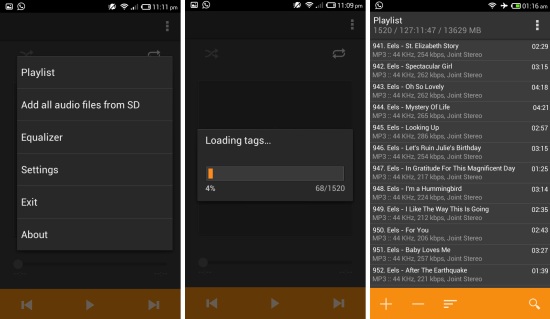 While on the main interface in the app, simply click on the menu button and then click on the ‘add all audio files from SD’ options as seen below. AIMP for Android will scan the SD card and then start adding the songs as seen here, which takes just about a minute or less. After this all you music files will be available in the playlist page of the app. Tap on a file to start playing it and to control play back swipe to the now playing interface.