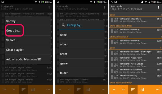 To make things manageable, you can group the songs by album, artist, genre, or folder. To do so, click on the menu button and then tap on the ‘group by’ option and select the way you would like to group the songs. In the screenshot below I have grouped the songs by album, making it much easier to handle files. Now it’s easier to find and play songs.