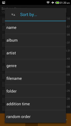 Once you have added songs to the app as explained above, the playlist will be populated as seen above. All the songs are shown as a list you can sort them by name, album, artist, genre, file name, folders, addition time, or show them in a random order. The long lists of songs are sorted in the manner you select, but still it remains a huge list.