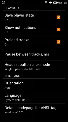 Clicking on the settings button provides you with the options as seen below. Here you can set orientation, decide what the headset button does, show or hide the now playing notification, preload tracks, change the language, and decide whether to save or not save the player state. You can see that the interface is fairly simple and the options are minimal and simple.