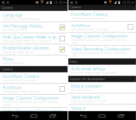 In the settings of Spy Camera OS for Android, you get the ability to enable or disable info message, auto focus, and vibration, configure image and video capture parameters, and more.
