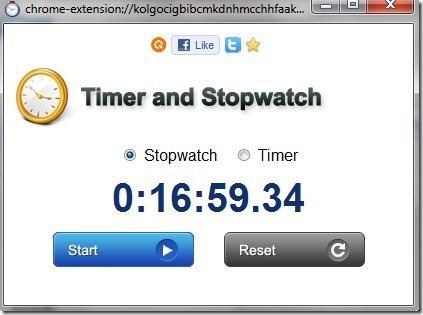 Stopwatch app is a free Chrome stopwatch app for your Google Chrome. After installing the app, just launch the app, click on the start button, and the stopwatch starts working. Now, click on stop button to capture the time or click on reset button to start the time again on this Stopwatch app. Also, the background provided by the app looks great with light yellow and black color combination. Install this stopwatch app, if you are searching for a light weight app for your Chrome browser.