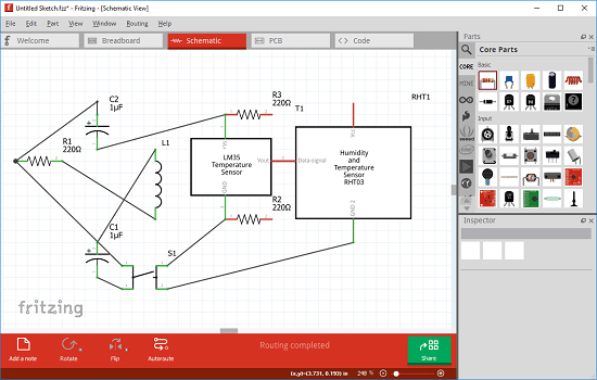 Fritzing is one of the best free electrical design software for Windows. It is an open source software as well that you can use. You will find a very long range of electrical instruments and devices in this software. The workspace that it offers is very intuitive and supports zoom, pan, drag like features. You can organize different electrical components on it and then you can join them with the help of wired connections.