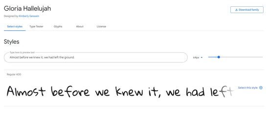 This is a slightly connected typeface but not a true script. The style of the handwriting is inspiring and makes a person happy and upbeat. It is available for personal use only and has been designed by Kimberly Geswein and offered by Google Fonts.
