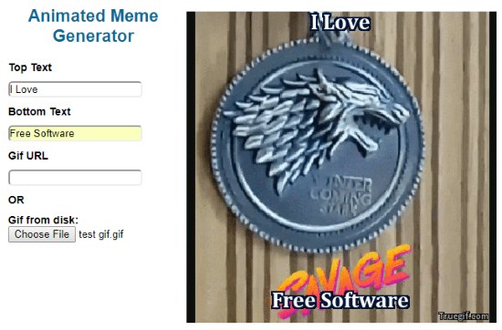 Meme Generator (by TrueGif) is also free online GIF meme maker to create animated memes. This one also allows you to import a GIF file via URL or from your PC. After that, it will allow you to add a meme text at the top as well as at the bottom. Once done adding the top and bottom text, you will be able to customize the text. It lets you change the text color, outline color, text size, outline border size, and the text font. You can save the GIF memes to your PC as animated GIFs. Do note that this website imprints a small watermark at the bottom right corner of the resulting memes.