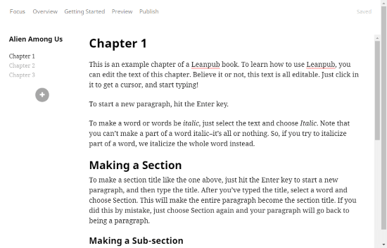 Leanpub is a combination of online writing tools and publishing platform. If you are into novel writing then this website can be very useful for you. It has simple writing tools where you can create a book. You can add chapters to your book which are indexed on the left side in the editor. The editor has all the basic formatting option and also support images.