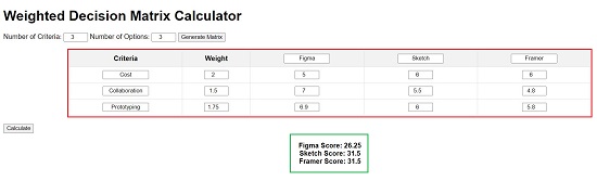 Click here to navigate to ilovefreesw Weighted Decision Matrix Calculator. To access its source code, click here.