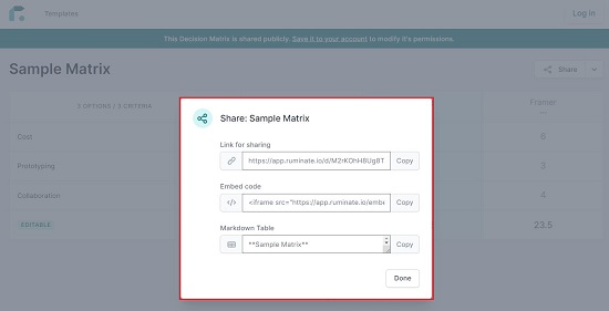 All that you need to do now is watch the final score. Clearly, the winning option will be the one whose total score is the highest. If you need to share the final Matrix with anyone, you can click on the ‘Share’ button and copy the weblink (URL). You can also copy the Embed code or Markdown table and use it wherever you desire.
