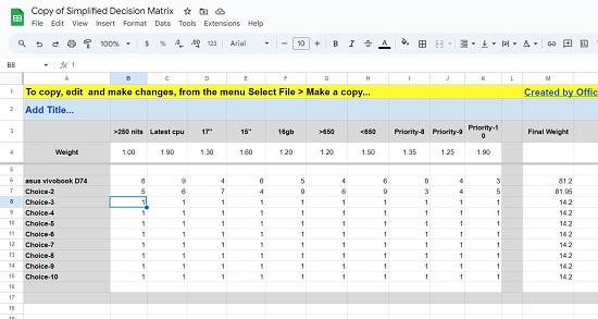 Next, specify the Weight for every Priority based on its considered. Now, go ahead and specify the Scores for every Priority under each and every Choice and you will visualize the total scores are automatically updated in real time at the end of each row. The Choice with the highest score is the clear winner and you can take your decision based on it.