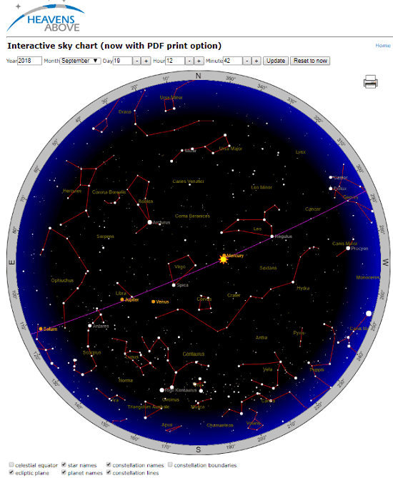Heavens Above is another free website that you can use to generate a sky chart for specific date and export that. Here it is a simple website that allows you to save the sky chart as an image. This website actually works in a pretty straightforward manner. You specify date, time, location, and it will load the corresponding sky chart on its interface. You can then customize the view and then save the sky chart. Here it lets you export the sky chart as a printable PDF file.