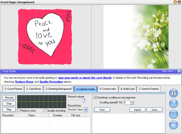 What I’m talking about is the fact that you can add things like recorded audio, next to images and text, to the greeting cards that you create using Ecard Magic. Card setup is done by going through each of the 7 tabs at the bottom of the application window. First you choose cover pictures, then card background music, greeting background, record an audio clip with a personal message, add contact info, build the card (create the executable) and lastly send it to everyone that needs to receive the greeting card. Card can be sent to multiple people using the built-in email sender. Important thing to note is that the application requires you to pick up a free username and registration key from the website in order to activate it and remove watermarks from the created eCards.