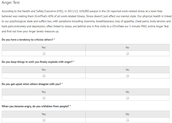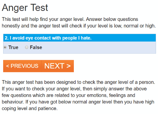 Just How Angry Are You? is a 10 questions long test from British Association Anger Management. It has a bit different questions from the above mentioned tests. For the questions, you need to give answer as Yes or No. You will need to submit your name and email (optionally) to get test result. The score is provided out of 50 and it also tells what the score means.