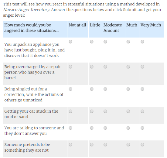 This Anger Test from Psychologist World is a more extensive test than the above mentioned test. It has a set of 25 situations for which you have to tell how angry these situations will make you if happened in real. The options range from Not At All to Very Much. Additionally, you are also asked about your age group, gender, and your country. The result just gives you a percentage as score, which will help you decide if you have anger issues or not.