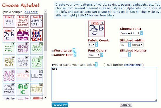 Crossstitch.com is another website to generate cross stitch letters online. It offers 6 free cross stitch fonts accompanied by 34 premium fonts. You can use any free fonts to make beautiful design pattern of cross stitch letters. Here, you can customize your cross stitch letters by variating the fabric count, stitch width and stitch heigh; you can change the letters’ size and color as well. And, if you want to create a long text with cross stitch letters, you get options to enable word warp and change the alignment to the center.