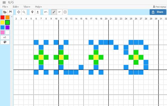 StitchFiddle is an online editor where you can design your own cross-stitch letters and patterns. It does not offer any built-in cross stitch alphabets or designs, instead, you can create cross stitch letters from scratch with this editor. Obviously, this is not an ideal cross stitch letter generator for all, but people can use it to carve out their imagination. After creating your design here, you can download it as a PNG image or print it as a PDF.