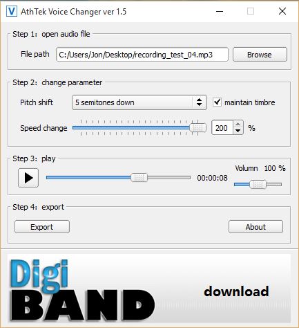 Next in step 2, use the pitch shift and speed change to do the actual voice changing. In the 3rd step you’ll get a chance to preview the effect that you’ve setup by tweaking the pitch and speed of the recording. Last step is to initiate the actual export of the finished product. Now I had some problems with test files. Application seems to be a bit picky about what kind of codecs and audio settings (no 48000khz audio support) will work. Keep that in mind if you decide to go with Free Voice Changer.