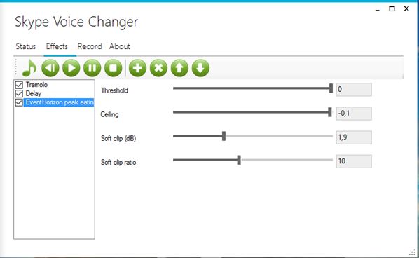 Great thing about Skype Voice Changer is that it’s optimized for Skype, so if you have Skype installed, it will automatically tweak everything so that it works with Skype. Drawback is that it only works with Skype. To tweak the application, and the desired effects, open it up and head over to the “Effects” tab. Use the plus icon in the toolbar up top to add effects. Available effects include tremolo, delay, super pitch, chorus, and EventHorizon peak eating limiter. Each effect is further customizable using the sliders to the right. Pro version of Skype Voice Changer also allows you to record Skype calls.