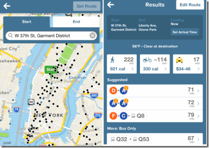 Citymapper is a free transit app for iPhone which displays the route and add-on information for the source and destination entered by you. Currently, the app supports only New York, Washington DC, Boston, London, Paris, and Berlin. The app displays all the available routes including the specific routes involving trains, bikes, subways, buses only. Among all the available routes, app includes the Rain Free route and Jetpack Route. The Jetpack route is the fastest route for the entered locations. The app also displays the calories burned (for walking/cycling route) and fare to pay (for bus/train routes) including weather at the destination.