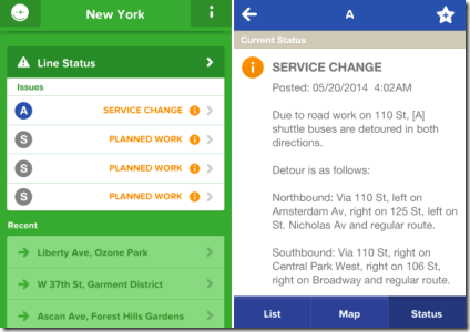 The app lets you pin your home, office, and any other location so that you don’t have to enter these locations again and again to find the routes. You can search for all the Bus stops, Subway stations, Rail stations, and Citi Bike stations for any location. If there are some stops which you use frequently then you can add them to My Favorite Stops option. Besides this, the app has a option called Line Status which shows all the repair or similar works going on at different routes with in the city selected by you. The app also displays the alternate routes which you can use to avoid these problems and continue to have a smooth journey. The app is fully synced with the Citymapper website which you can use via same profile.