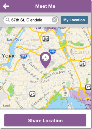 - Meet Me Somewhere: This option lets you share your or any other location with others. Suppose, there is someone who wants to meet you and he/she doesn’t know the location which you have fixed for meeting. Using this option, you can find that location on the map and share the location with that person. You can search for the location manually or using the app. The location can be shared via Facebook, Twitter, and mail. When that person will get the link using the media used by you for sharing, he can click on the link to view location on the map and also to get routes to reach there. The link can be opened in the browser on PC .